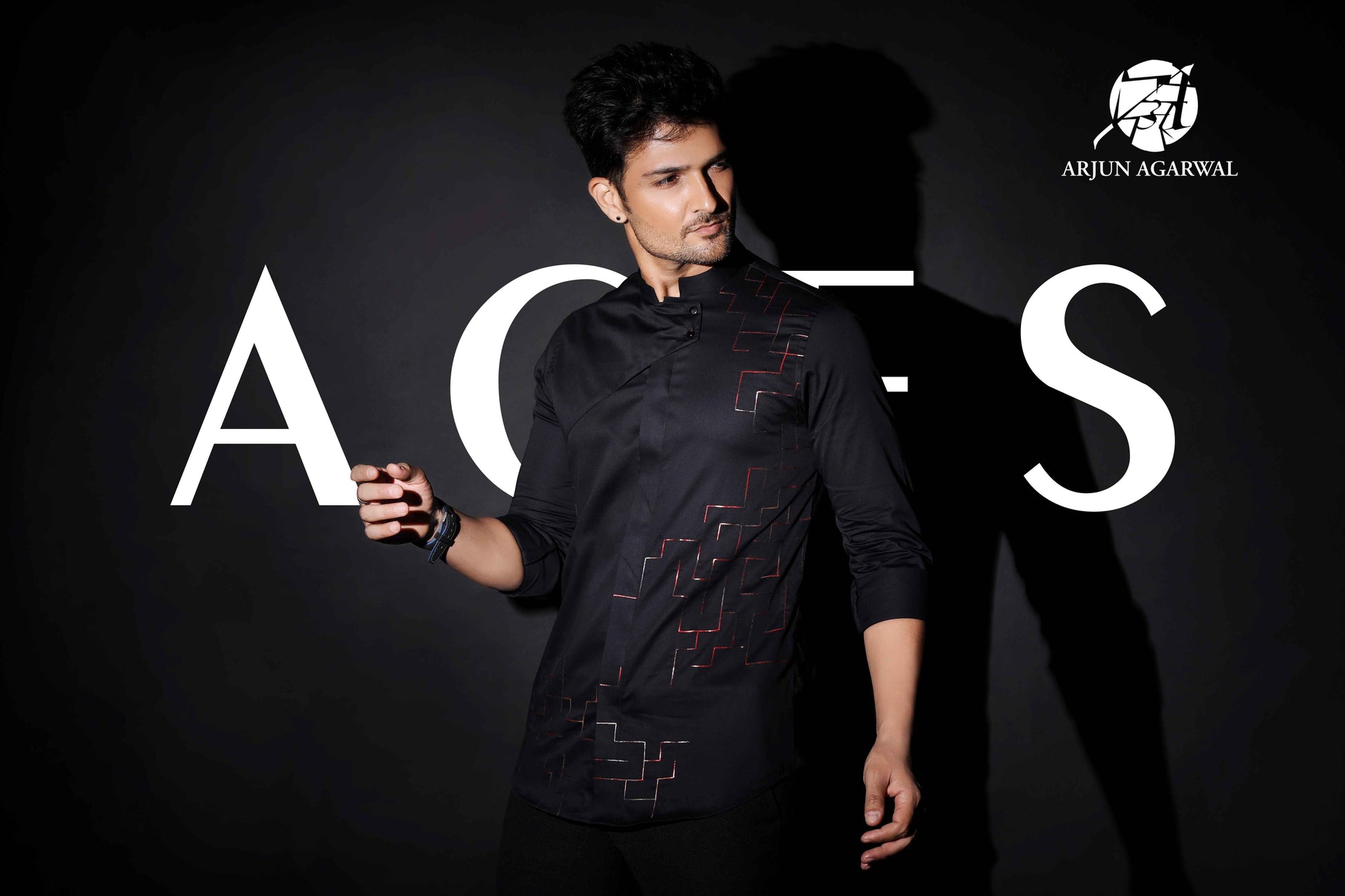 featuring a black shirt in cottom base ith metallic embroidery details. style it with pants, making it a great choice for stylish party wear and festive occasions.