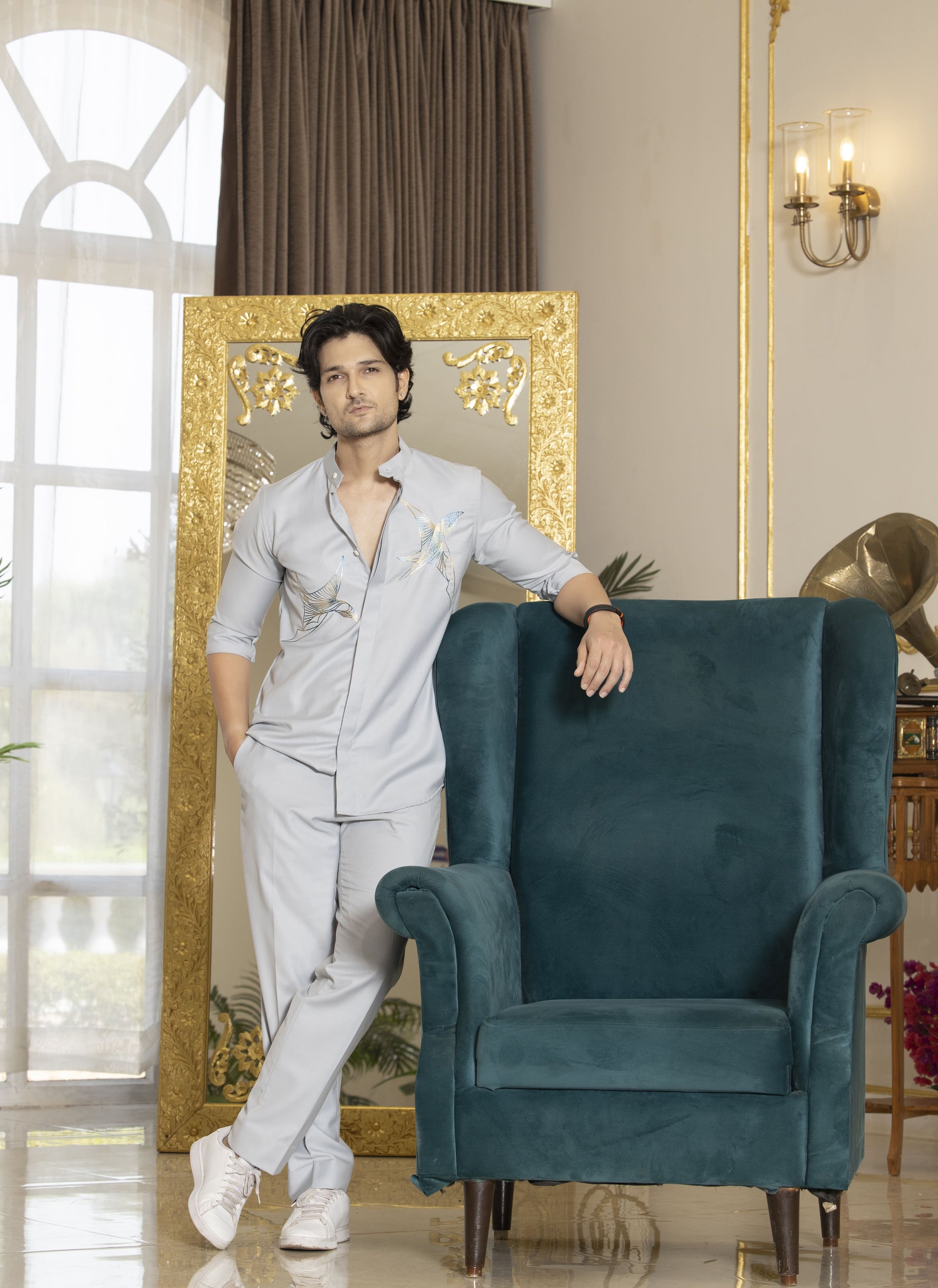 Featuring an ice blue shirt in cottom base with metallic embroidery details. styled with tapered pants which have embroidery details, make it a great choice for a stylish party wear and festive occasions.