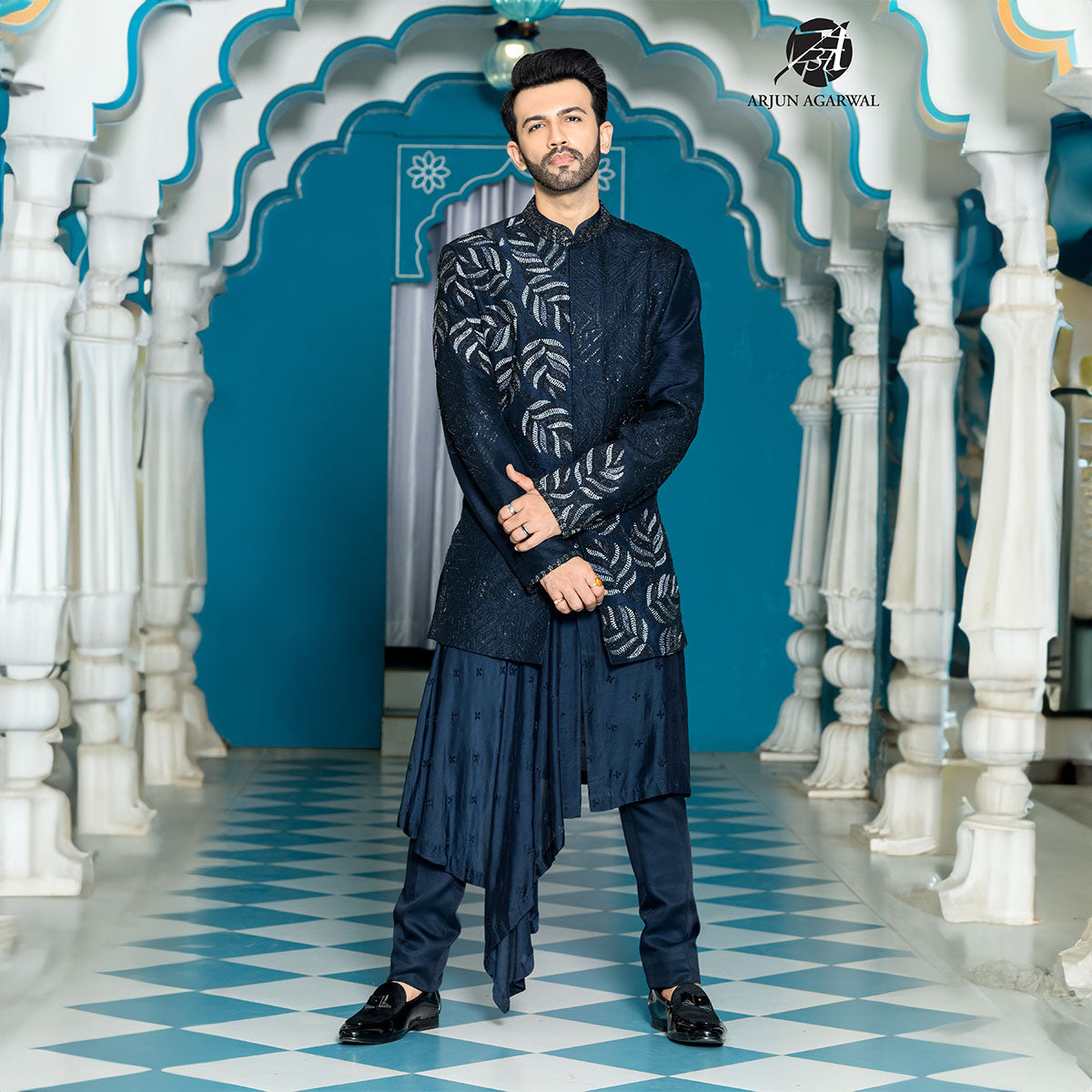Achkan with signature cutdana and sequence hand embroidery embellishments.The french knot and sequence highlights with intricate details add to the dapper look.It is paired with a matching trousers.