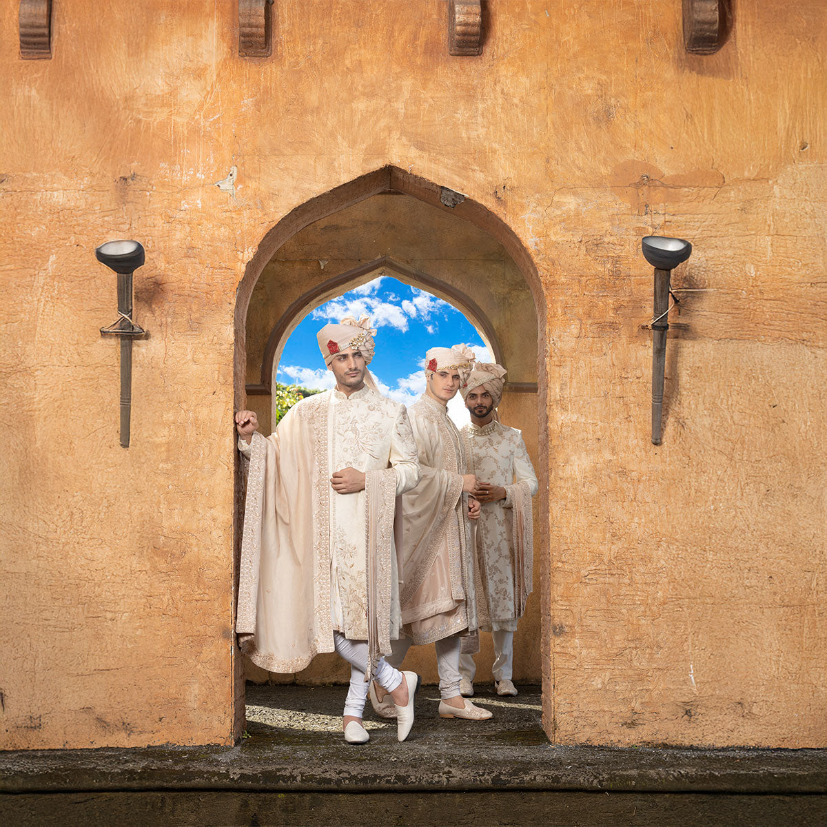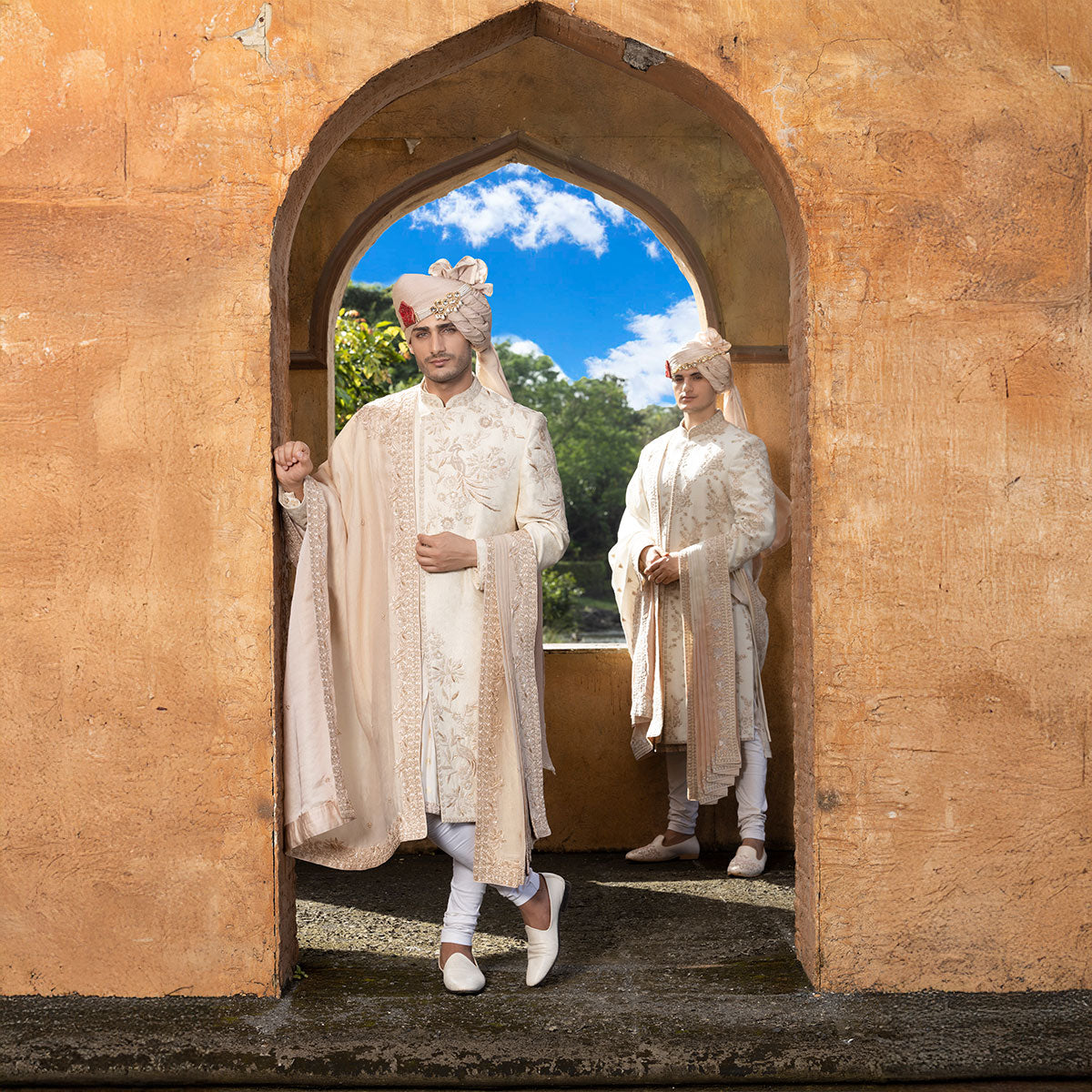 Silk sherwani with signature french knot and sequence hand embroidery with beautiful motifs .The set is paired with our classic pleated kurta with gold print and our signature border.The churidar is also made of our most loved stretch AA fabric for comfort .The silk shawl is the hero of our AA look with hand embroidery details and our signature style.