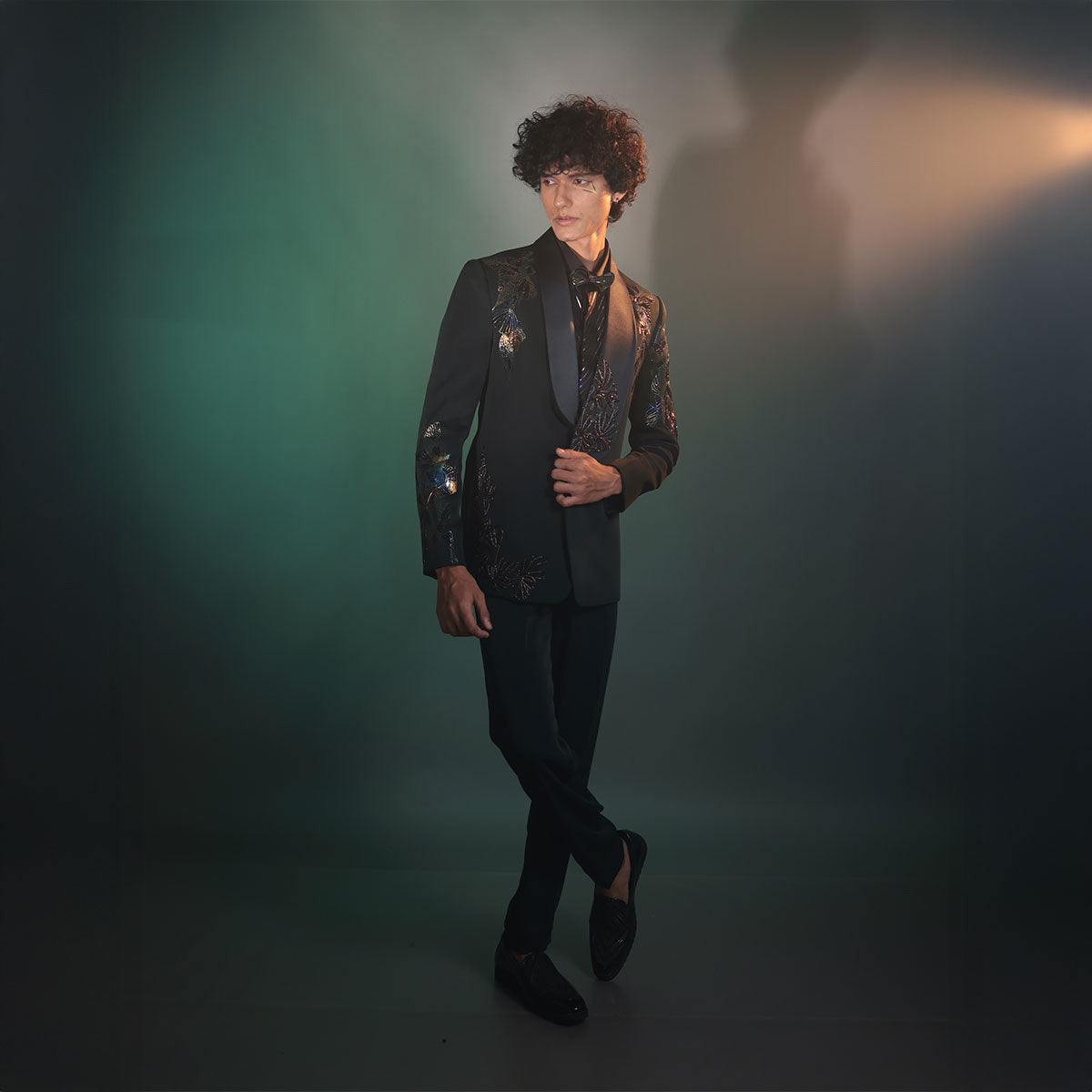 AA tuxedos are made of fine stretch suiting fabric styled with signature silhouette and lapels.the set comes with matching tapered trousers for a sharp look.they are styled with different shirts that can be customised accordingly. Embriodery is intricate with our classic applique technie & sequenece with Cutdana hand work to add extra shine.