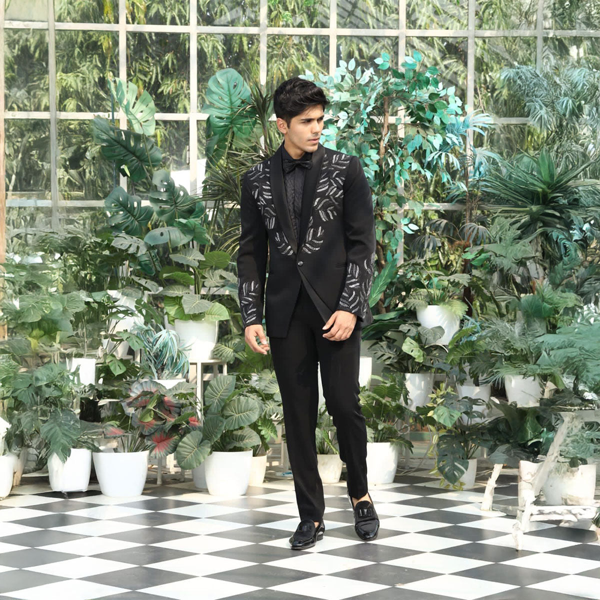 AA tuxedos are made of fine stretch suiting fabric styled with signature silhouette and lapels.the set comes with matching tapered trousers for a sharp look.they are styled with different shirts that can be customised accordingly. Embriodery is intricate with our classic applique technie & sequenece with Cutdana hand work to add extra shine.